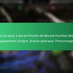 Les packs à durée limitée dans Mortal Kombat Mobile offrent une variété de bonus spéciaux qui améliorent le gameplay. Ces bonus incluent généralement des personnages exclusifs, des skins uniques, un équipement spécial et des boosts temporaires qui peuvent avoir un impact significatif sur vos performances lors des combats.